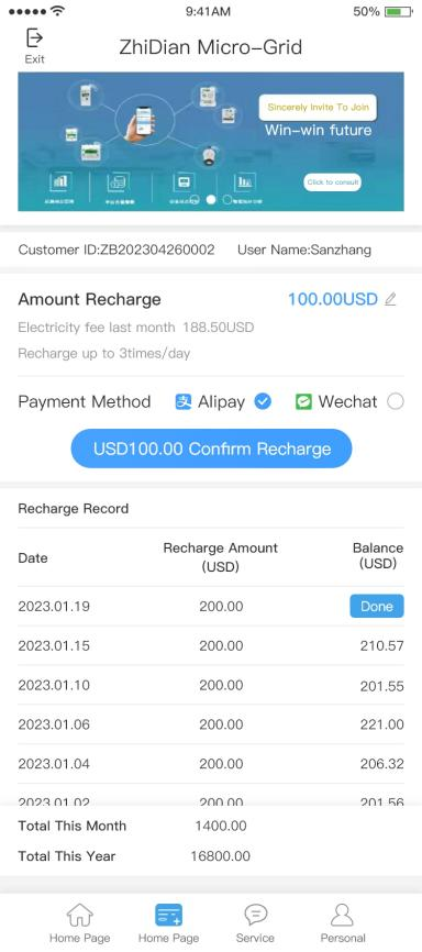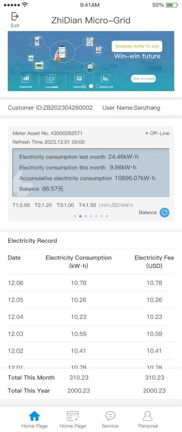 5.Historical power consumption records can be checked on mobile client. If third-party online payment is supported, you can recharge online.